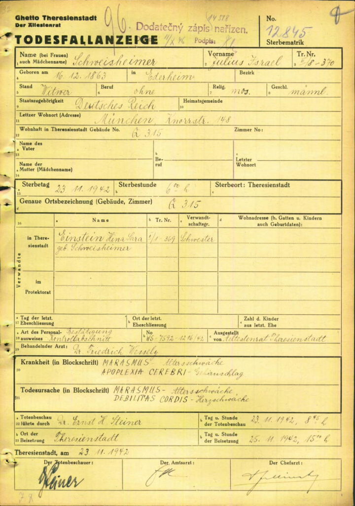 Todesfallanzeige von Julius Schweisheimer aus dem KZ Theresienstadt